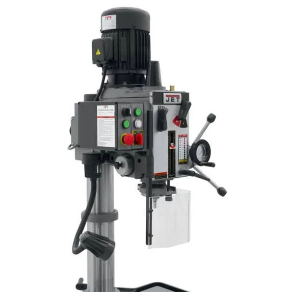 JET Geared Head Drill Presses are ideal for repetitive drilling in a wide variety of materials. These drill presses are equipped with helical gears for smooth and quiet operation, a quick-release drill ejector and English/Metric depth gauge. T-slotted table, 8 spindle speeds, and a head and table that rotate 360° around the column enhance overall use and supply premier results.