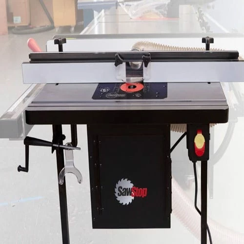 Enjoy the flatness and stability of a full-featured cast iron router table while also maximizing floor space in your shop. The SawStop RT-TGI Table attaches to your SawStop ICS table saw (sold separately); turning it into a central machining station capable of a huge variety of tasks from rough dimensioning to detail routing. The router table has precision-machined slots; an external power switch for your router; two support legs; and an extruded fence with adjustable faces; jointing shims; a 2-1/4″ dust port and adjustable scales. Mount it on either the left or the right of your saw.